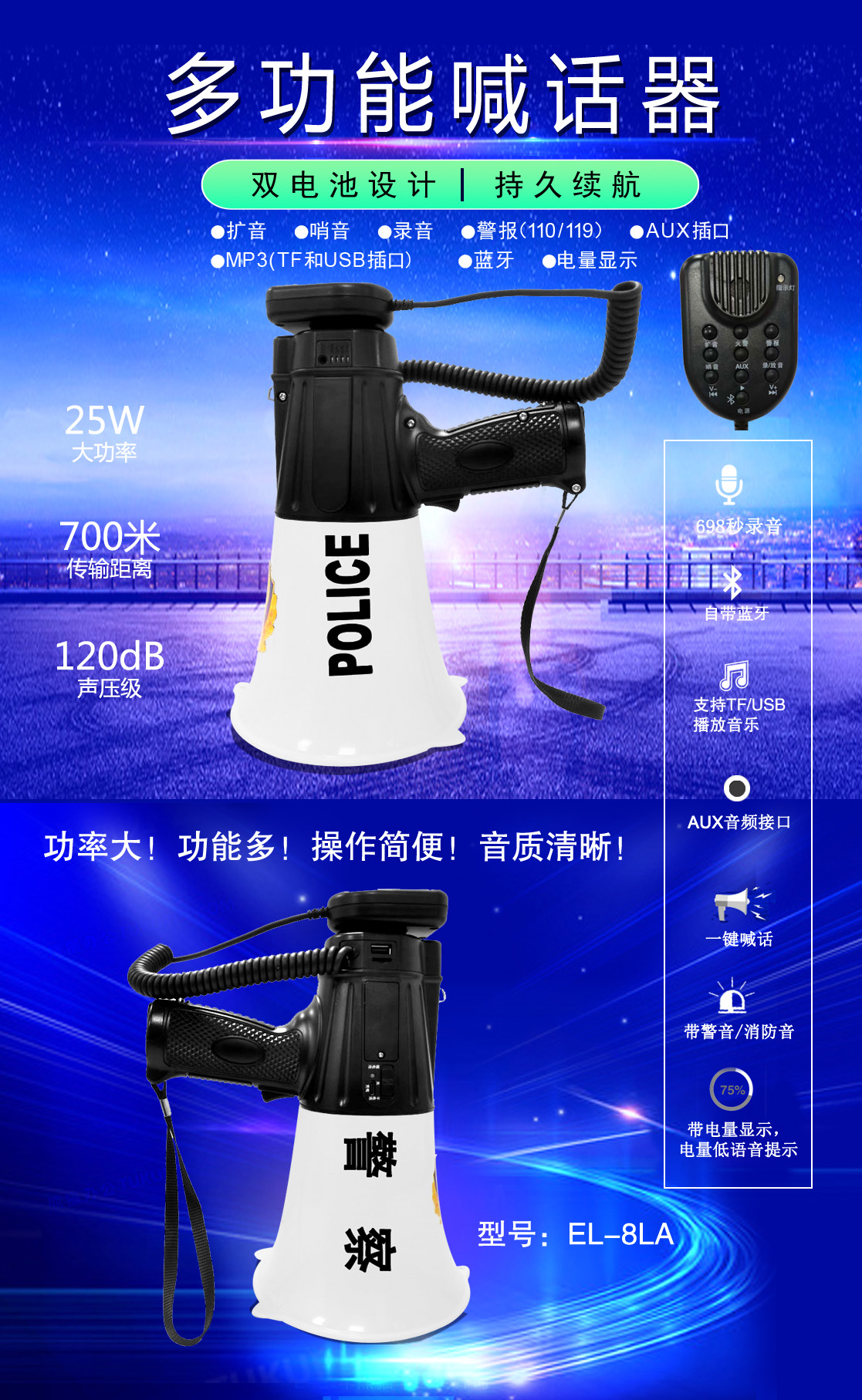 • 專業(yè)設(shè)計,外觀獨(dú)特、新穎,操作簡便的多功能喊話器
