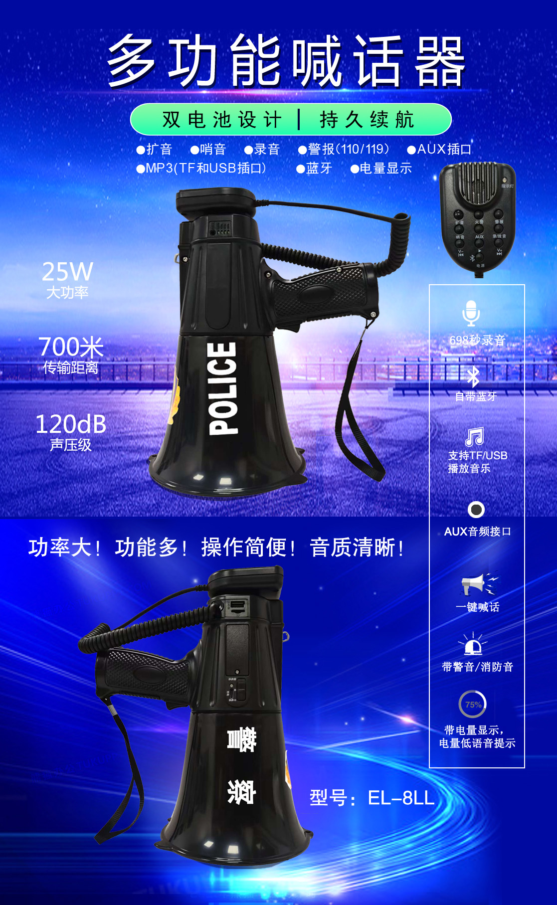 • 專業(yè)設計,外觀獨特、新穎,操作簡便的多功能喊話器