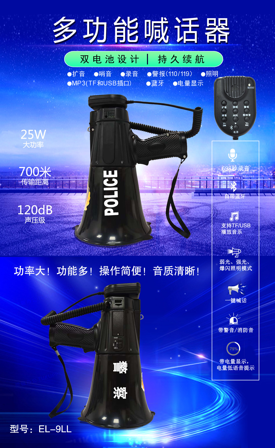 • 專業(yè)設計,外觀獨特、新穎,操作簡便的多功能喊話器