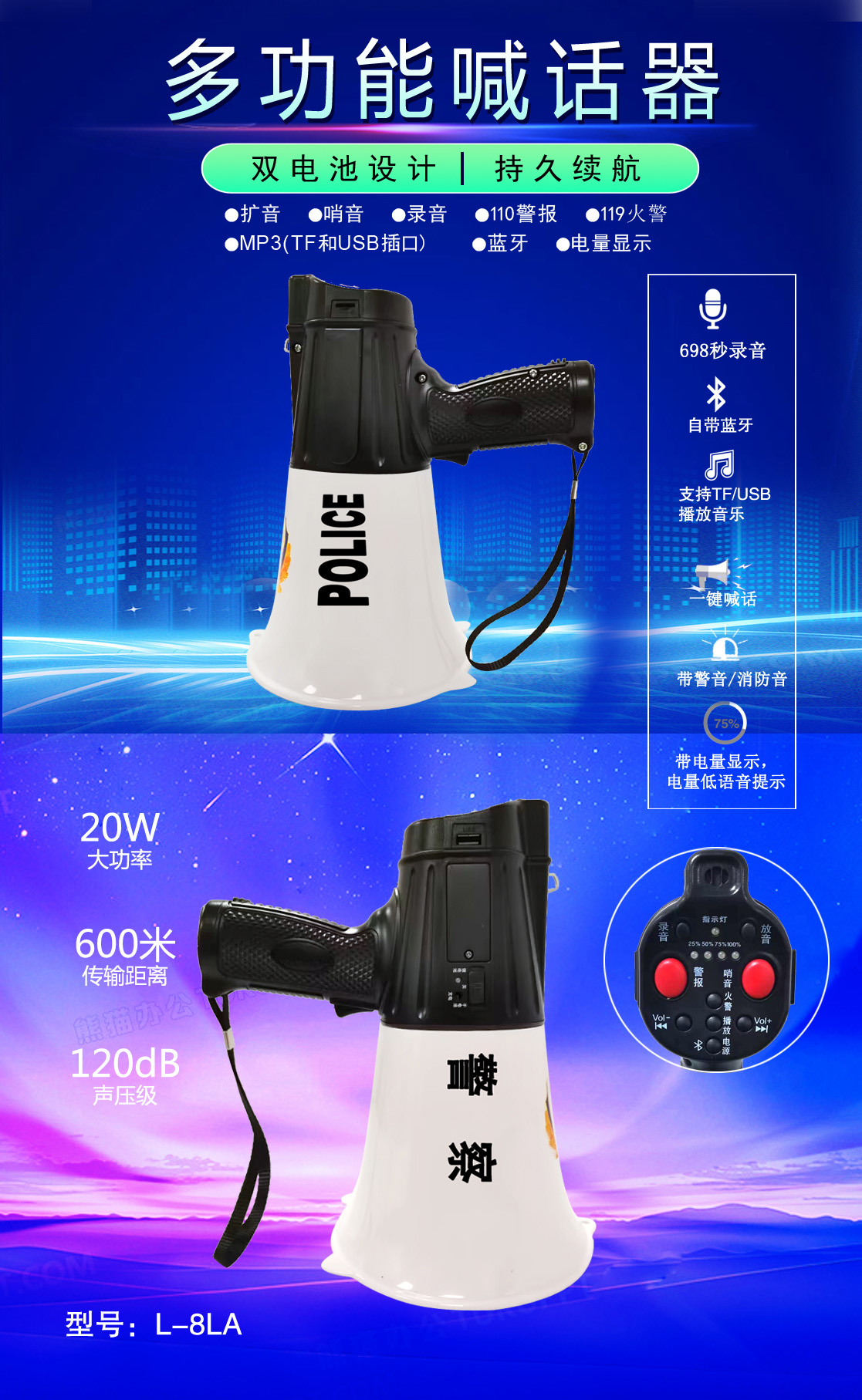 • 專業(yè)設(shè)計,外觀獨特、新穎,操作簡便的多功能喊話器